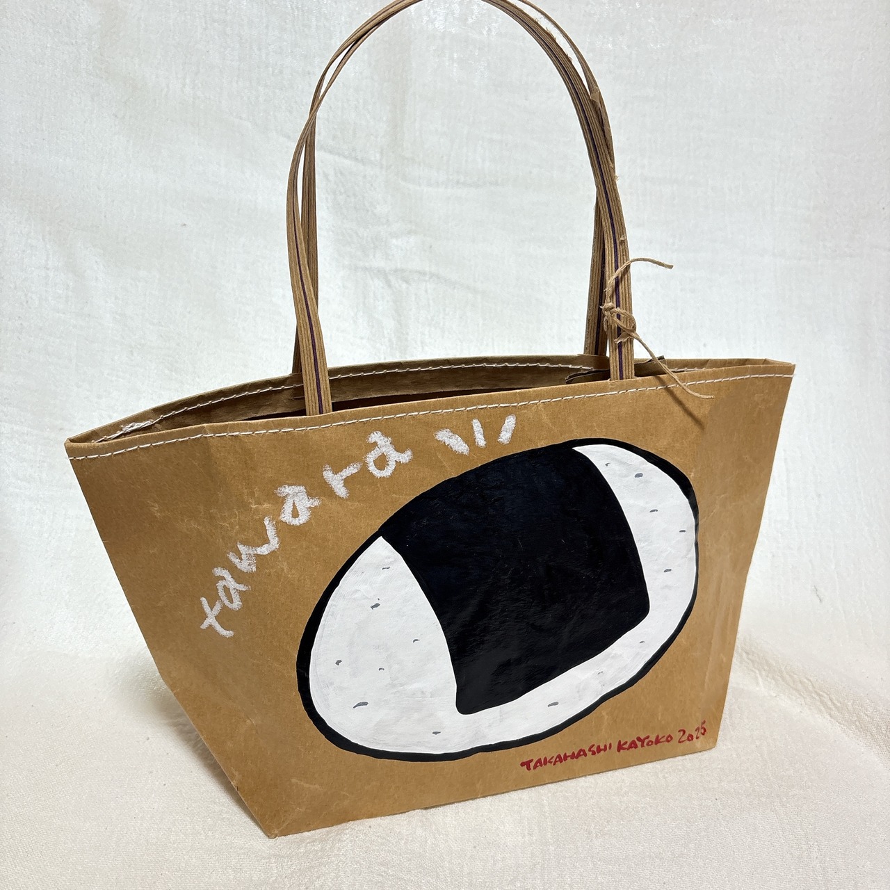米袋で作られた[米袋バッグお袋さん]にイラストを1枚1枚描いています。