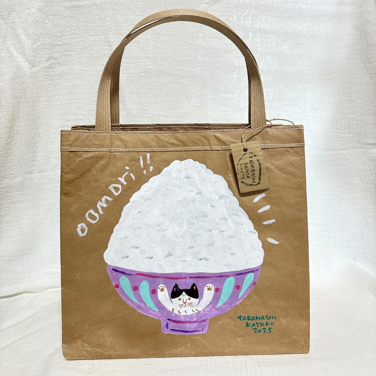 再利用した米袋で作られた[米袋バッグお袋さん]にイラストを1枚1枚描いています。