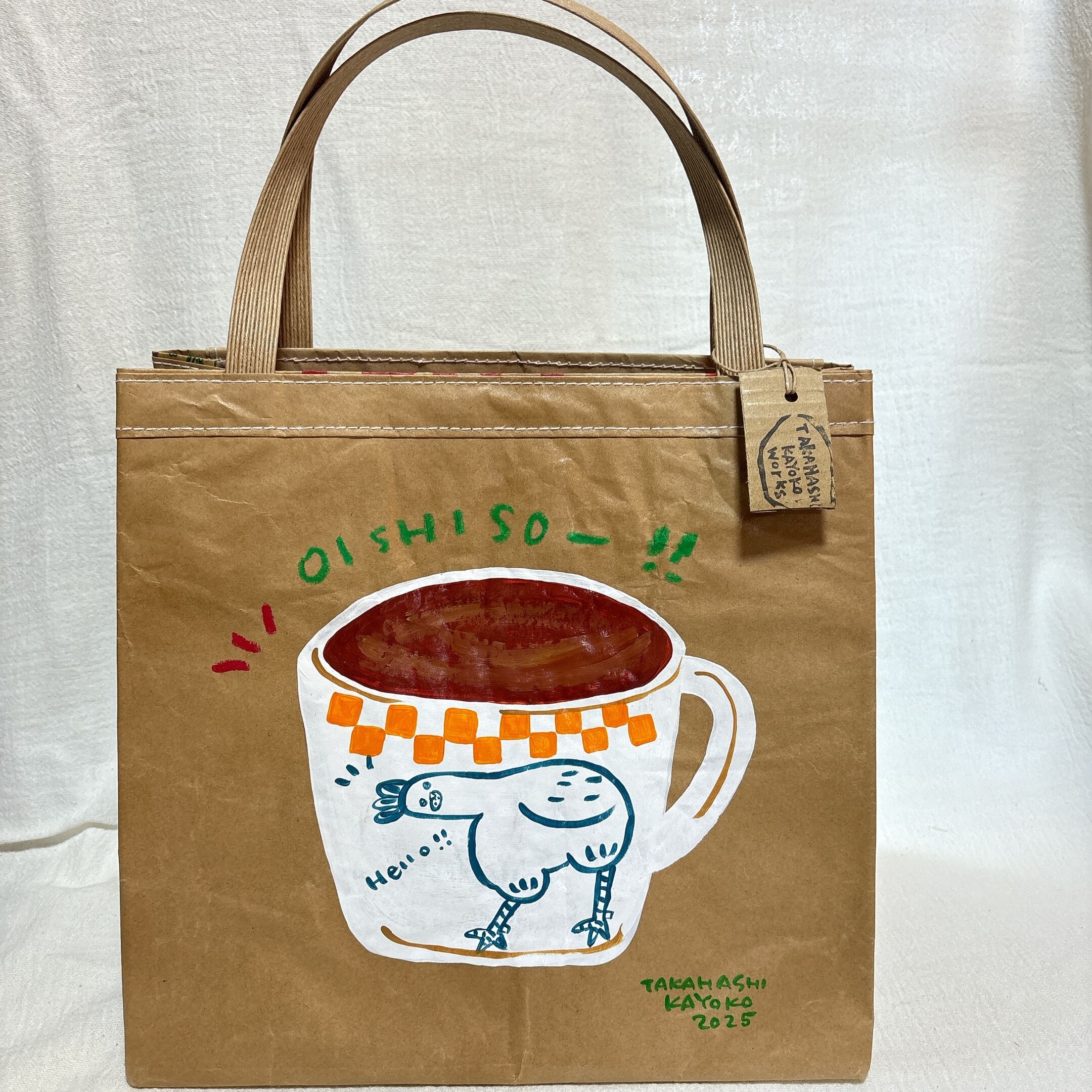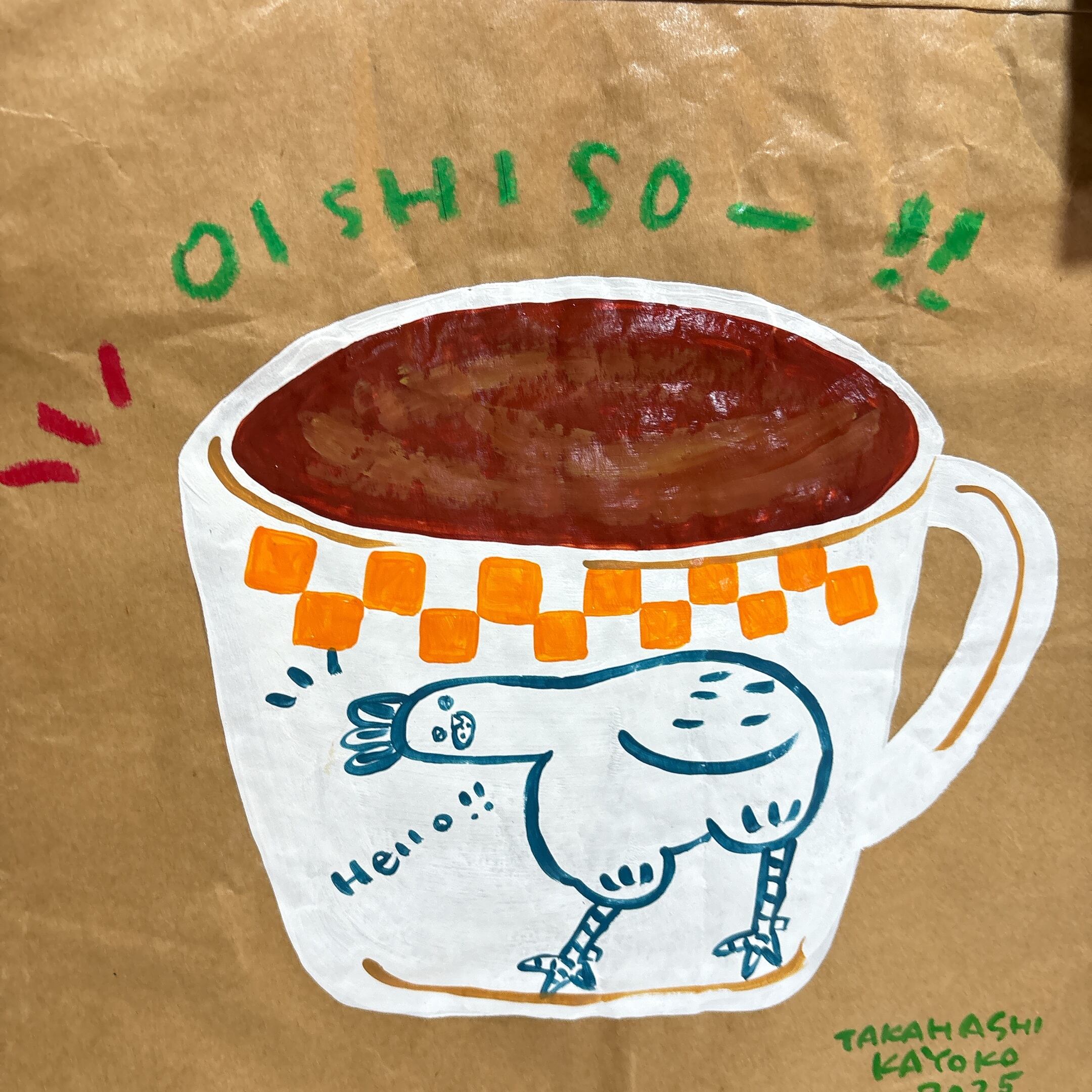 再利用した米袋で作られた[米袋バッグお袋さん]にイラストを1枚1枚描いています。