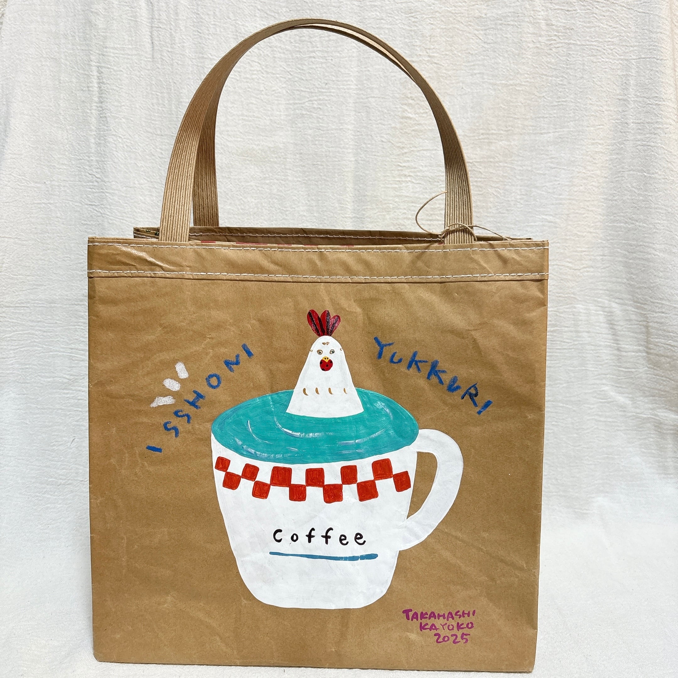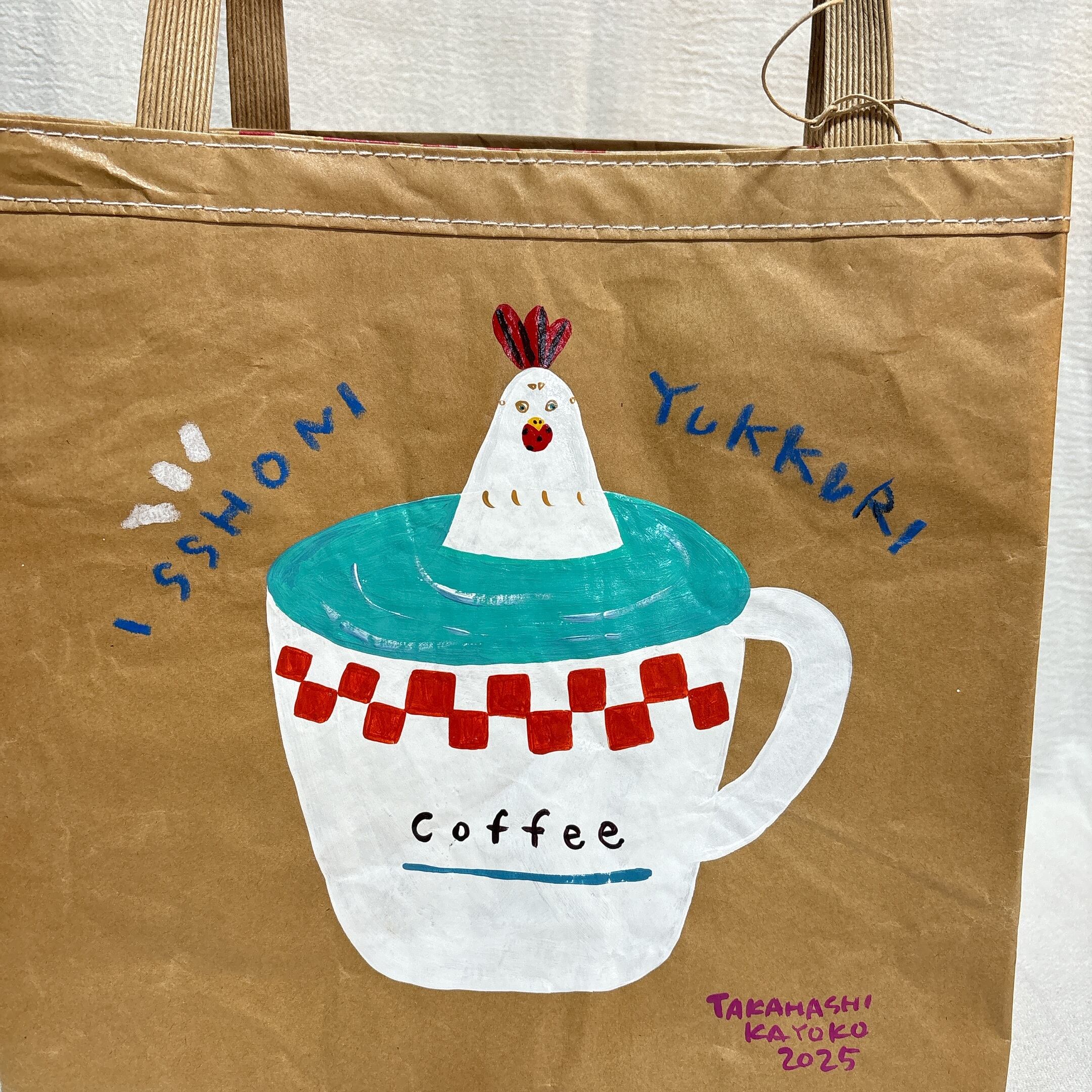 再利用した米袋で作られた[米袋バッグお袋さん]にイラストを1枚1枚描いています。