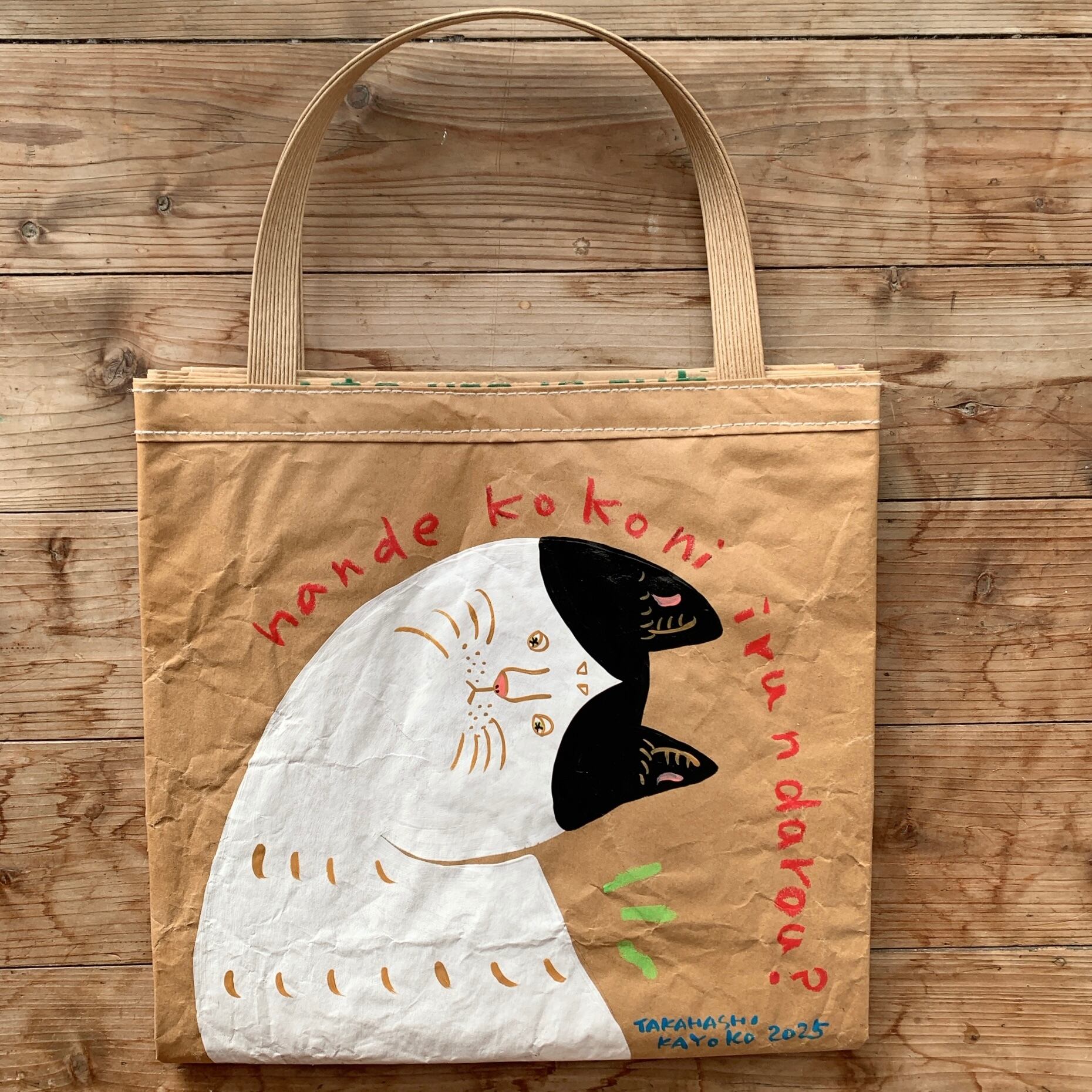 米袋で作られた米袋で作られた[米袋バッグお袋さん]にイラストを1枚1枚描いています。