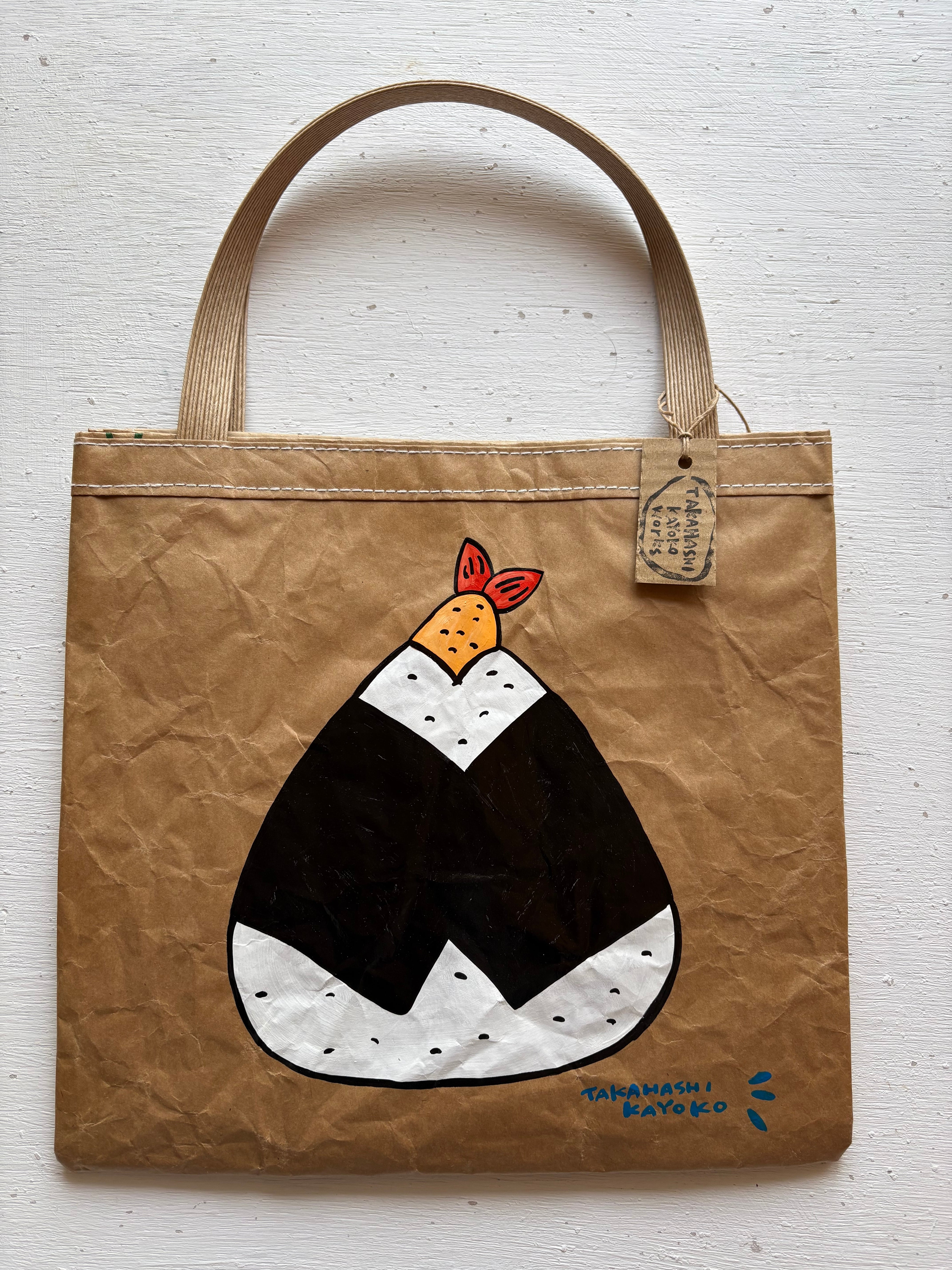 米袋で作られた米袋で作られた[米袋バッグお袋さん]にイラストを1枚1枚描いています。